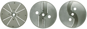 Mit dem optional lieferbaren Schneidscheibensortiment bestehend aus Raspel-, Schneid-, Kronen-, Streifen- und Sichelmesser-Scheiben bewältigen Sie alle an-fallenden Aufgaben bei der Verarbeitung von Kartoffeln, Zwiebeln, Kohl, Gurke, Möhren, Tomaten, Porree, Pilze, Paprika, Obst, Nüsse, Käse, Schokolade und vieles mehr. Mit den praxisorientierten Vario-Sichelmesser- und Streifenschei-ben stehen Ihnen durch individuell verstellbare mm-Rasterschnittstärken mehre-re Scheibenfunktionen zur Verfügung.